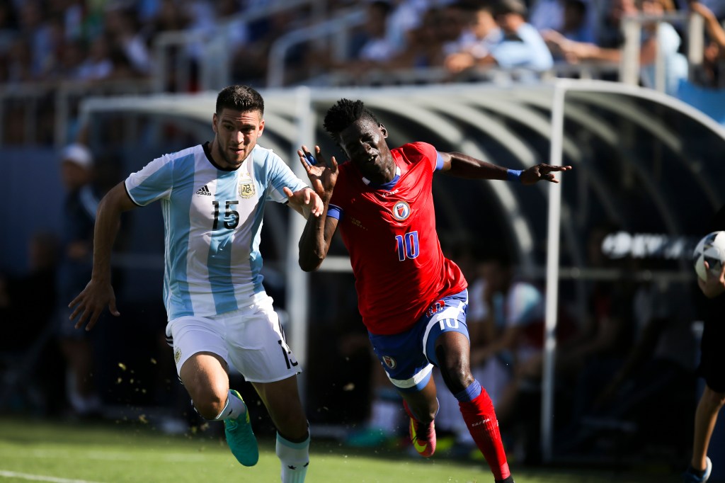 Woodensky Cherefant of Haiti, right, and Lisandro Magallan of Argentina, left, during a friendly between the two nations at Florida Atlantic University Stadium on Sunday, July 24, 2016. Argentina would go on to win 3-1. For Argentina the friendly will serve as preparation for the Olympics in Rio next month. Randy Vazquez, Sun Sentinel