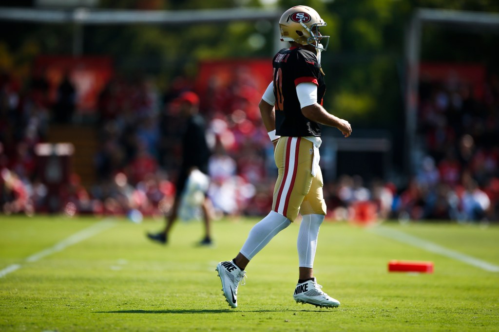 San Francisco 49ers’ wide receiver Kendrick Bourne (84), left, and teammate defensive back Adrian Colbert (27), right, run a one-on-one drill during training camp at the teams’ practice facility in Santa Clara, Calif., on Tuesday, July 31, 2018. (Randy Vazquez/ Bay Area News Group)