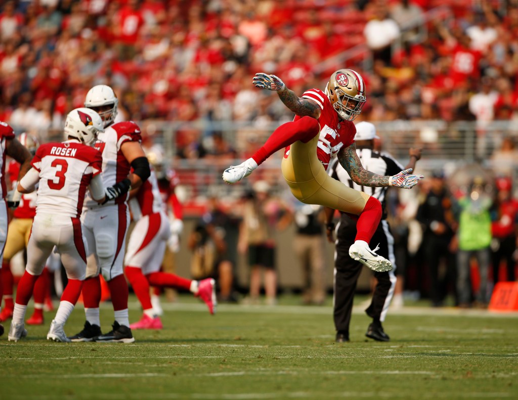 San Francisco 49ers starting quarterback C.J. Beathard (3), left, throws a pass out of bounds after being pressured by Arizona Cardinals’ Josh Bynes (57), right, in the second quarter of their game at Levi’s Stadium in Santa Clara, Calif., on Sunday, Oct. 7, 2018.(Randy Vazquez/Bay Area News Group)